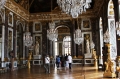 最著名部分是二楼的“镜厅”尽显当年皇室的奢华之风,是凡尔赛宫不同于其他皇宫的地方。“镜厅”呈长方形,73米长、14米宽,400多块的镜片分别装在17扇落地窗和四周的墙壁上,镜子由483块镜片镶嵌而成,将外面的蓝天、绿树都映照出来,别有一番景色。拱形天花板上是勒勃兰的巨幅油画,描绘了中世纪人们生活场面的巨幅油画(油画内容是路易十四刻意要追求的效果,表现的都是泰承路易十四在1661到1678年间的统治,这些颂扬国王的艺术增添了皇位上的光环)。厅内两旁排有罗马皇帝的雕像和古天神的塑像,并有3排挂烛台、32座多支烛台和8座可插150支蜡烛的高烛台,经镜面反射可形成3000支烛台,映照得整个大厅金壁辉煌。站在厅堂中央,人们可在各角度的巨镜中,看到自己一连串由大而小的影子。当年皇室贵族尽情欢乐、豪华奢靡的生活由此可见一斑。