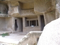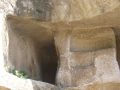 古崖居前区面积最大,但损坏的程度也最严重。整个山体看去,坍塌的部分使石窟从中剖开,内部结构和布局一目了然,特别是那些原在石窟内连接上一层,现已坍塌的残留石阶,看的更是一清二楚。在一幢相通的两居室和三居室,可以看那些修凿有回龙弯道的火炕,和设施齐全的厨房及卧室,抚摸那光滑笔直的墙壁,站在堂屋伸臂测量顶高,寻找古人在此居住时的真实感觉,体会西奚民族的生活习性和方式,探讨先人们修建防御工事和民居建筑的思路,令人感慨万分。